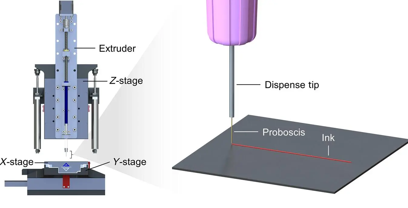 经过一系列精细操作之后,蚊子的口器就被做成了微米尺度3D打印喷口,接下来,研究人员将其安装在特制的3D打印系统上,然后对其进行测试。