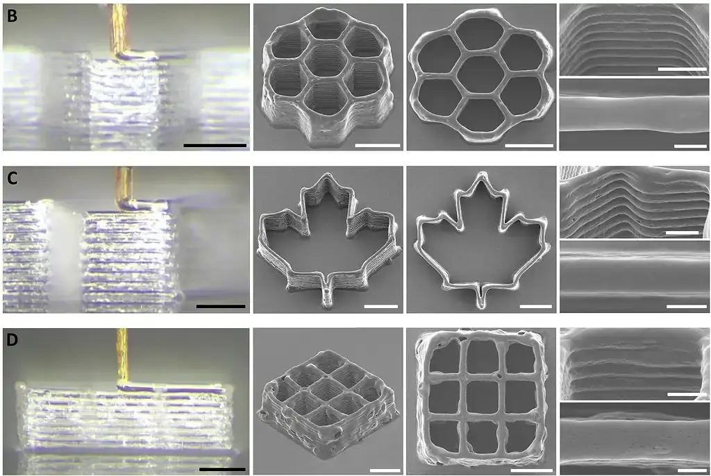 在测试工作中,研究人员利用这种喷口打印了多种微米级的结构,例如规则的网格、复杂的图案,还有可用于包裹细胞的微型支架,结果表明,其打印效果简直是绝了。